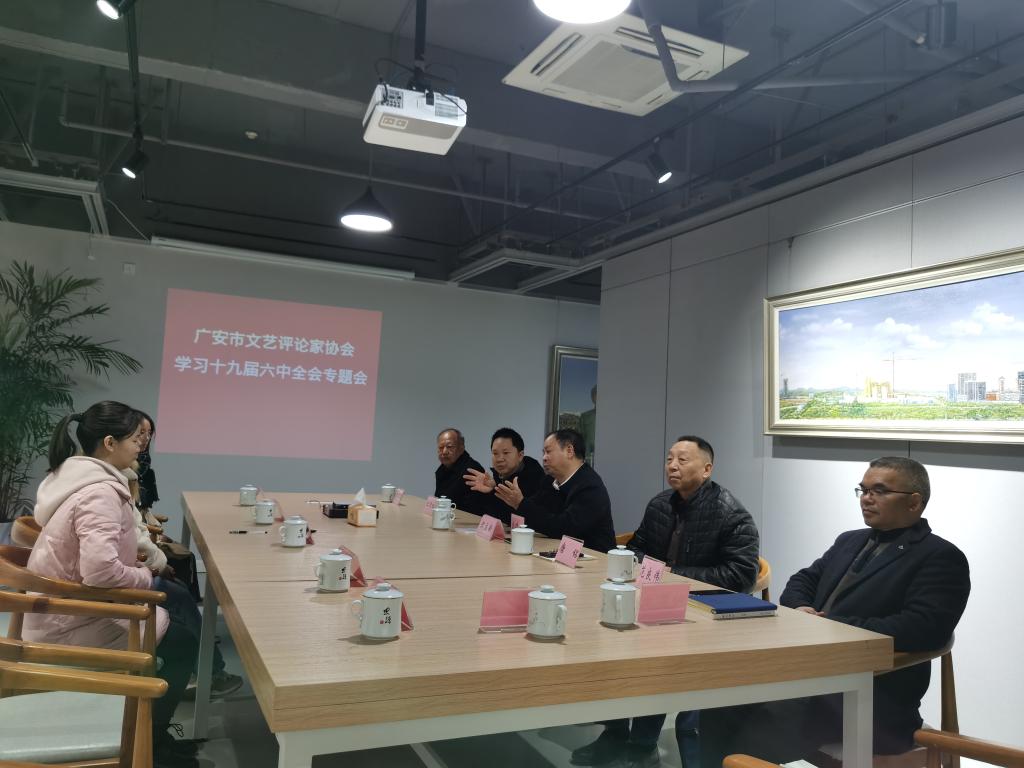 12月10日下午,广安市文艺评论家协会学习十九届六中全会精神专题会在广安职业技术学院茂林文化艺术中心举行,协会主席团成员、理事及部分新加入协会的会员参加了本次学习。会议由市评协副主席王雪松主持。